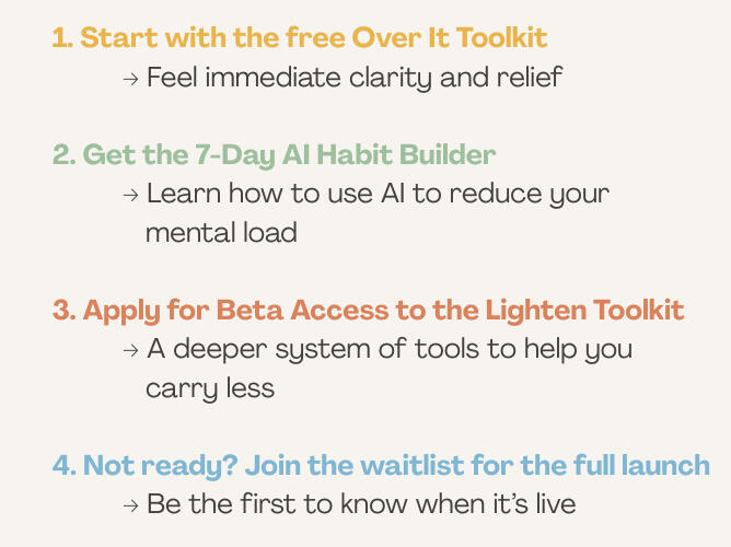 Yes. You can. And it helps.So I created Lighten—a plug-and-play system of helpers and tools designed to offload the invisible labor of modern motherhood.No pressure. No perfection.